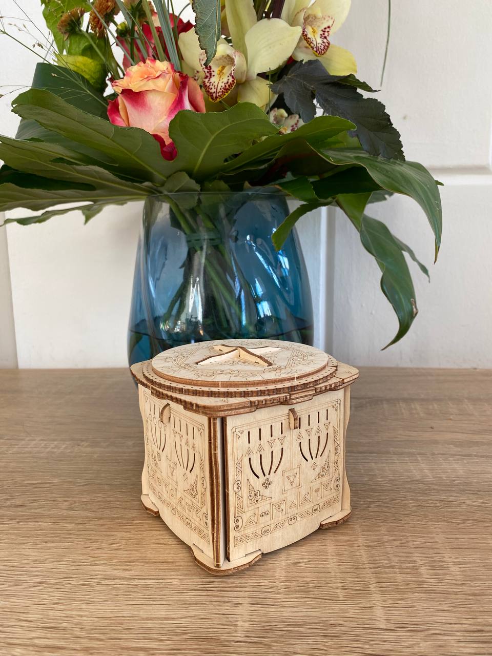 For those who don't know it, it is a kind of 3D wooden puzzle that you have to assemble and when you finish it it is a little box where you can store things inside (money, vouchers...). The trick is that it has tricks to open it.